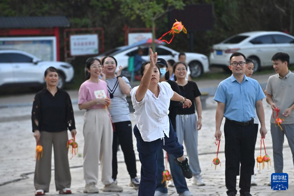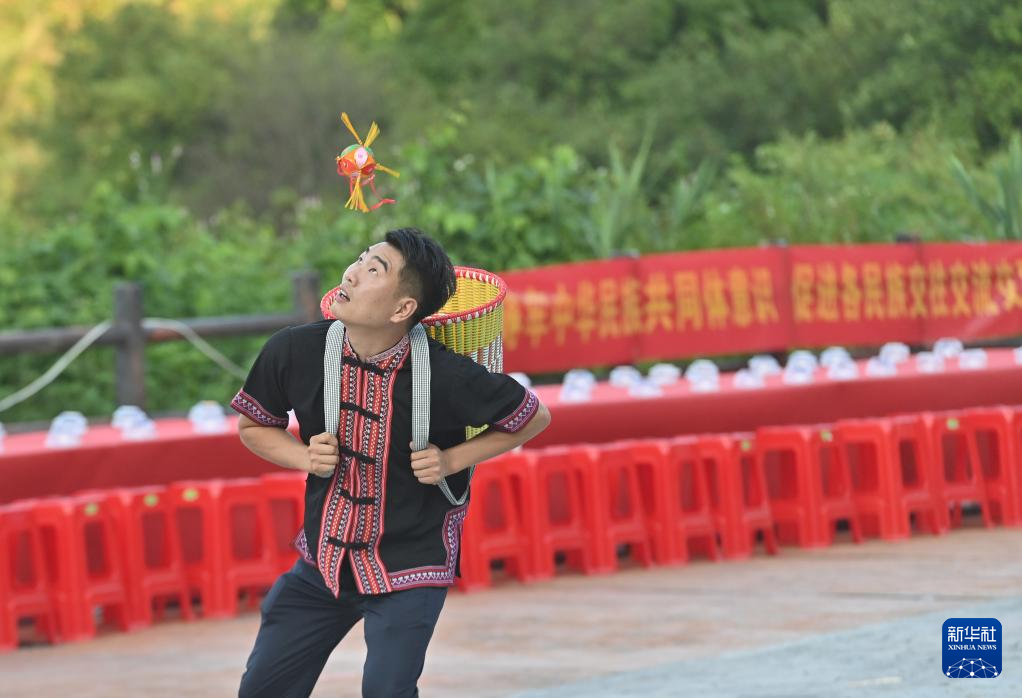 9月5日,廣西梧州市委統(tǒng)戰(zhàn)部、市民宗委、市工商聯(lián)等部門開展民族團結進步創(chuàng)建主題活動,當?shù)馗髯甯刹咳罕娡ㄟ^拋繡球、板鞋競速、篝火晚會等內容豐富、形式新穎的民俗系列文體活動,促進各民族交往交流交融。新華社記者 黃孝邦 攝