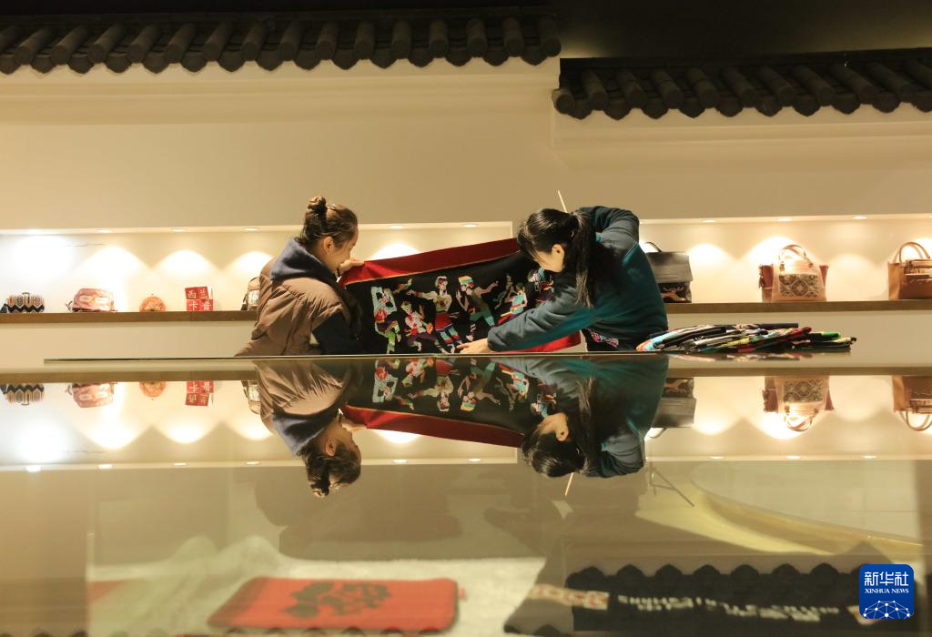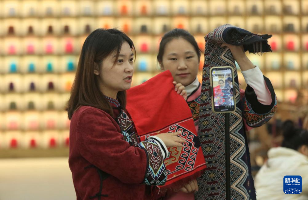 立冬過后,湖南省張家界市武陵源區(qū)非遺土家族織錦生產(chǎn)企業(yè)根據(jù)顧客訂單,制作圍巾、披肩、拖鞋、頭飾等冬季系列織錦產(chǎn)品,拓展線上線下銷售渠道,迎接冬天銷售旺季。新華社發(fā)(吳勇兵攝)