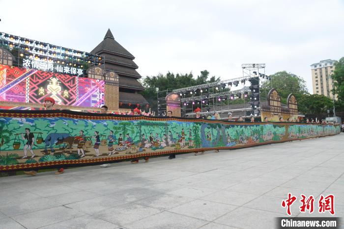 4月11日,2024年海南黎族苗族傳統(tǒng)節(jié)日“三月三”節(jié)慶活動(dòng)主會(huì)場開幕式暨文藝演出在保亭黎族苗族自治縣舉行。圖為黎族民俗風(fēng)情黎錦長卷展示。張?jiān)潞?攝 據(jù)介紹,黎族民俗風(fēng)情黎錦長卷長186.7米、寬1.38米,采用黎族紡織技藝“通經(jīng)斷緯法”織造,由十余名黎族織錦文化傳人、歷時(shí)近3年共同制作完成。內(nèi)容包括黎族傳統(tǒng)生產(chǎn)生活、婚俗、制陶等12部分,共呈現(xiàn)50多個(gè)畫面、598個(gè)人物,是一幅了解海南黎族傳統(tǒng)文化的歷史畫卷。 當(dāng)晚的長桌宴吸引許多民眾參加,人們身著黎族苗族服飾,沿長桌對坐,吃三色飯、品山蘭酒。來自美國的Marian Deborah Rosenberg(瑪麗安·黛博拉·羅森伯格)亦身穿黎族服飾赴宴,她喜歡黎錦艷麗的色彩,長桌宴這種特殊的用餐形式讓她感受到節(jié)日的氛圍,“人們與親友聚在一起祝酒說笑,熱鬧又開心”。