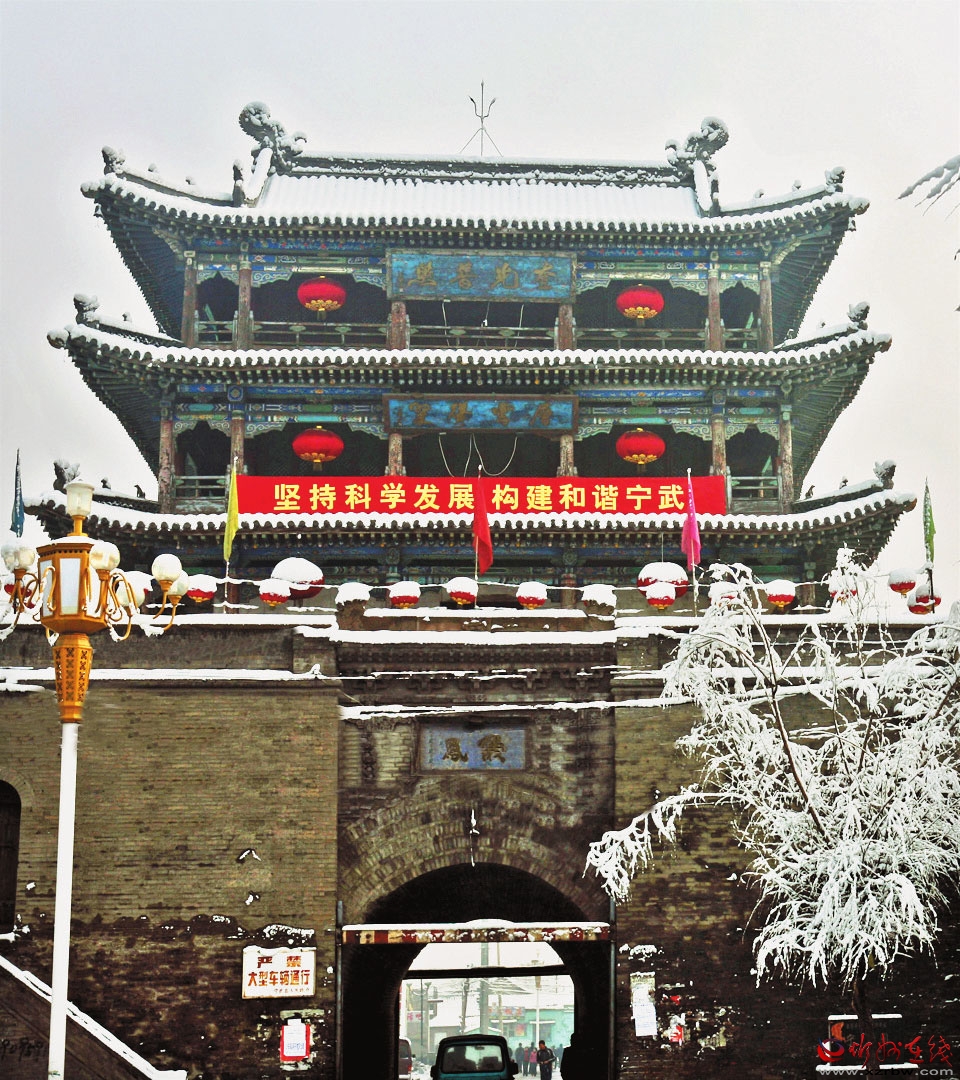 寧武關(guān)城,古稱鳳凰城,因?yàn)槌悄厦鎸?duì)的是鳳凰山,又因城池布局酷似展翅欲飛的鳳凰而得名。順華蓋山南麓因勢(shì)而筑的城池猶如鳳身,華蓋山頂?shù)淖o(hù)城墩為鳳首,向東西兩側(cè)延伸的大河堡、寧文堡猶如鳳凰展開(kāi)的雙翅,高高聳立于南城墻的迎薰門(mén)是鳳尾,城內(nèi)中心的鼓樓是心臟。站在城南的鳳凰山瞭望這座城池,日間城垛高壘,夜間萬(wàn)家燈火,由低而高,一只栩栩如生的鳳凰便展現(xiàn)在眼前。
