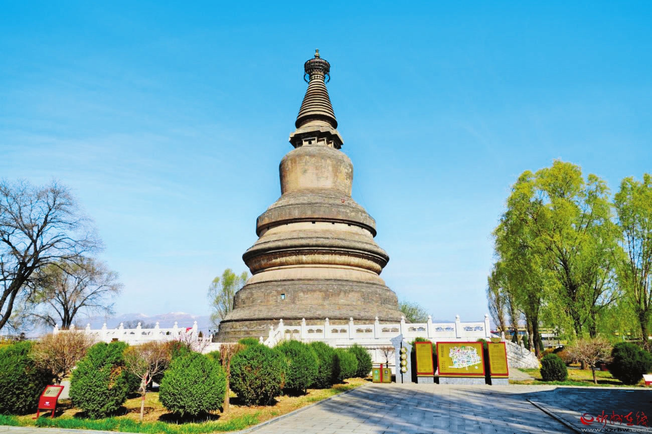 阿育王塔位于代縣上館鎮(zhèn)東北街村東大街北縣政府后院。據(jù)《代縣志》記載,原為圓果寺內(nèi)建筑,1937年日軍拆毀寺院,僅存磚塔。該塔始建于隋仁壽元年(601年),初為木結(jié)構(gòu),唐會昌五年(845年)“滅法”時被毀,唐大中元年(847年)、宋元豐三年(1080年)、崇寧元年(1102年)重建,元至元十二年(1275年)改建為磚塔。該塔為喇嘛式磚塔,通高40米,占地面積1876平方米。塔平面呈圓形,磚石砌臺基,底徑20米,高1.5米。臺基上設(shè)束腰基座,刻有仰覆蓮瓣及纏枝花紋。塔身為圓形覆缽,塔剎分為剎座、相輪、傘蓋和寶珠,剎座須彌式,座中心矗立1根鐵質(zhì)剎桿,砌相輪十三層,上置圓形露盤,狀為傘蓋,極頂置寶珠,上下疊置。2001年公布為全國重點文物保護單位。