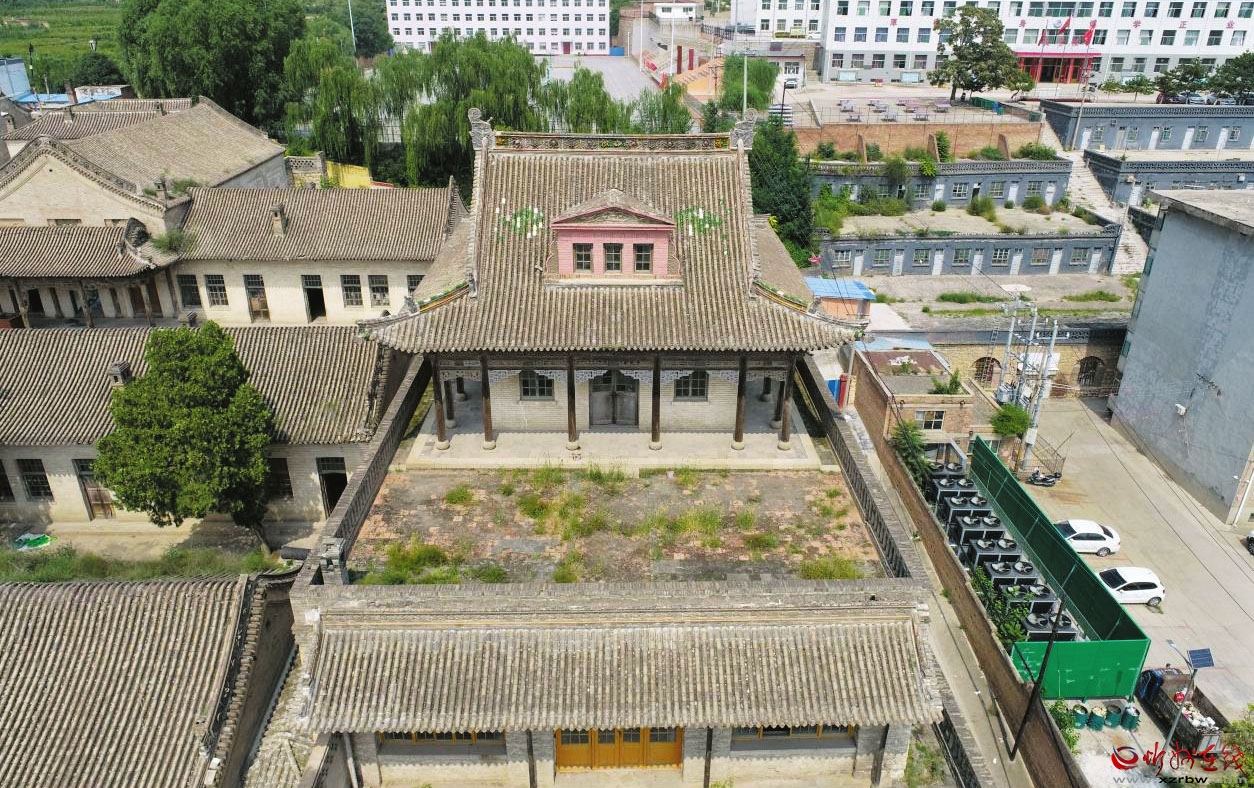 第四層平臺(tái)上,正對(duì)中軸線門(mén)洞的是大禮堂。大禮堂坐北朝南,長(zhǎng)45米、寬24米。禮堂前設(shè)卷棚歇山抱廈3間,石雕柱礎(chǔ)石,木雕圈口暗八仙,柱間雀替鏤空雕刻花卉、飛禽等圖案。斗拱三踩,柱頭科耍頭萬(wàn)字形,平身科耍頭龍形。禮堂內(nèi)置天花板,主席臺(tái)前木雕欄桿,上部設(shè)垂蓮柱;禮堂外左右各有5間教室,邊上為回長(zhǎng)廊。禮堂后建石券窯洞9間,為教師宿舍,窯洞頂建木結(jié)構(gòu)房間15間,為教學(xué)辦公區(qū);禮堂西側(cè)是寬闊的操場(chǎng)。
