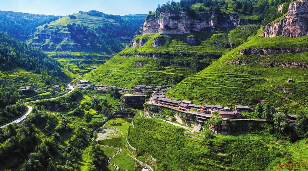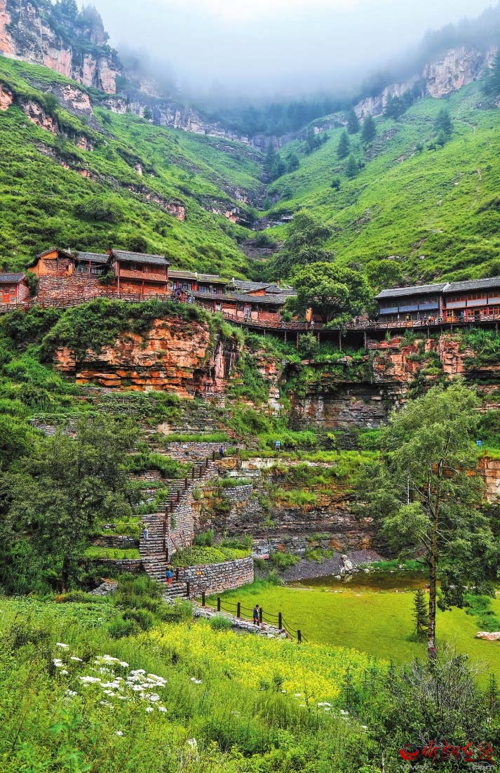 基巖構(gòu)造、河谷沖擊、垂直生態(tài)、冷涼氣候……有別于他處的雋永靈秀,寧武之境實乃神來之筆。懸空村位于寧武縣管涔山深處,現(xiàn)為蘆芽山風景區(qū)的一個景點,因村莊懸于峭壁之上而稱奇。村里多以石頭和木材建房,村中唯一道路是由圓木搭起的空中棧道,行于其上,猶如走在半空,從崖底仰望,似空中樓閣,故而得名。