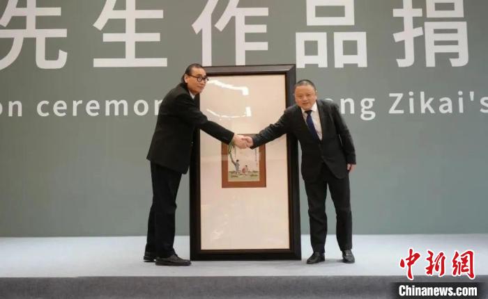 中國國家畫院院長(zhǎng)劉萬鳴(左)接受豐子愷家屬捐贈(zèng)的豐子愷國畫作品。 中國國家畫院供圖