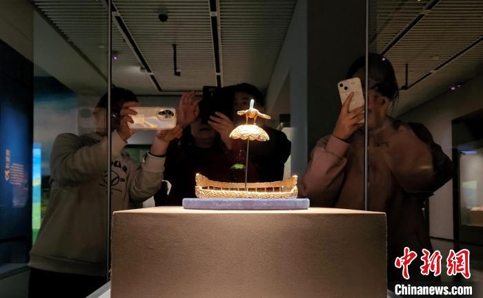 在山東博物館鄂爾多斯青銅文明展現(xiàn)場,觀眾欣賞匈奴鷹頂金冠。趙曉 攝 當天,“長河共飲 草原吉金——鄂爾多斯青銅文明展”在山東濟南開展。350余件(組)商周至漢代的鄂爾多斯青銅文物亮相,呈現(xiàn)“馬背上的游牧文化”。 記者在展廳內(nèi)看到,眾多青銅制品以動物形象為裝飾題材,猛虎、野狼、駿馬、鷹隼等姿態(tài)奔放、形象生動,折射游牧民族對生命力的崇拜。