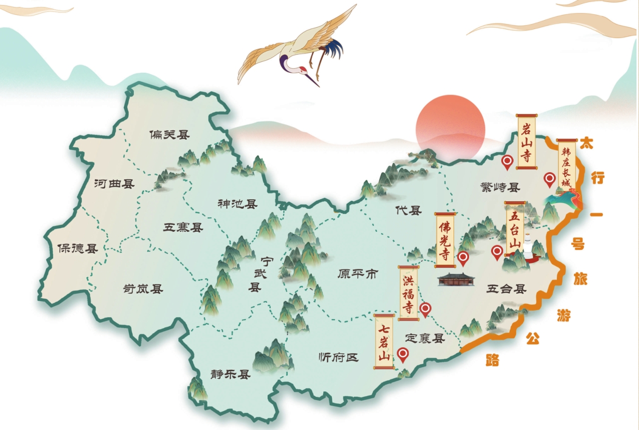 太行一號旅游公路是山西省農(nóng)村道路的重要組成部分,同時也是打造黃河、長城、太行三大旅游板塊,推進鄉(xiāng)村振興的戰(zhàn)略性基礎(chǔ)性工程。沿途貫穿忻州、太原、陽泉、晉中、長治、晉城6市45個縣(市、區(qū)),聯(lián)通全省122個A級以上景區(qū)、239個非A級旅游資源(點),主線已成功入選全國20條“行在鄉(xiāng)村,游在路上”的最美自駕精品路線。旅游公路忻州段起點位于五臺縣韓家樓村,途經(jīng)五臺山風景區(qū),終點與繁峙縣平型關(guān)長城一號旅游公路主線相接,全長185公里。