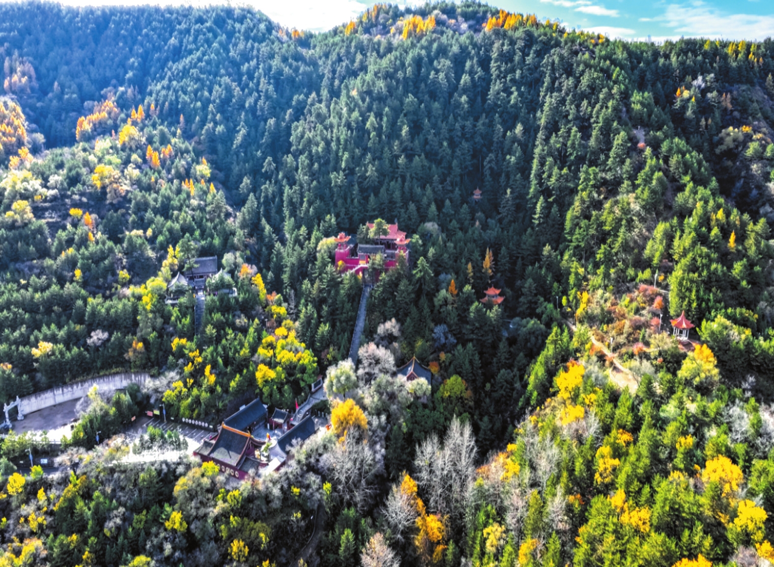 山林間宏大的廟宇建筑群始建于北魏時(shí)期,憑借清幽秀麗的自然風(fēng)光和深厚的文化底蘊(yùn),吸引了眾多高僧來此傳經(jīng)布道。隨著佛教文化的發(fā)展,與之相關(guān)的建筑藝術(shù)、雕塑藝術(shù)、壁畫藝術(shù)歷代都有發(fā)展,可惜大部分毀于戰(zhàn)火。1992年開始重建,集儒釋道于一體的廟宇群規(guī)模宏大。