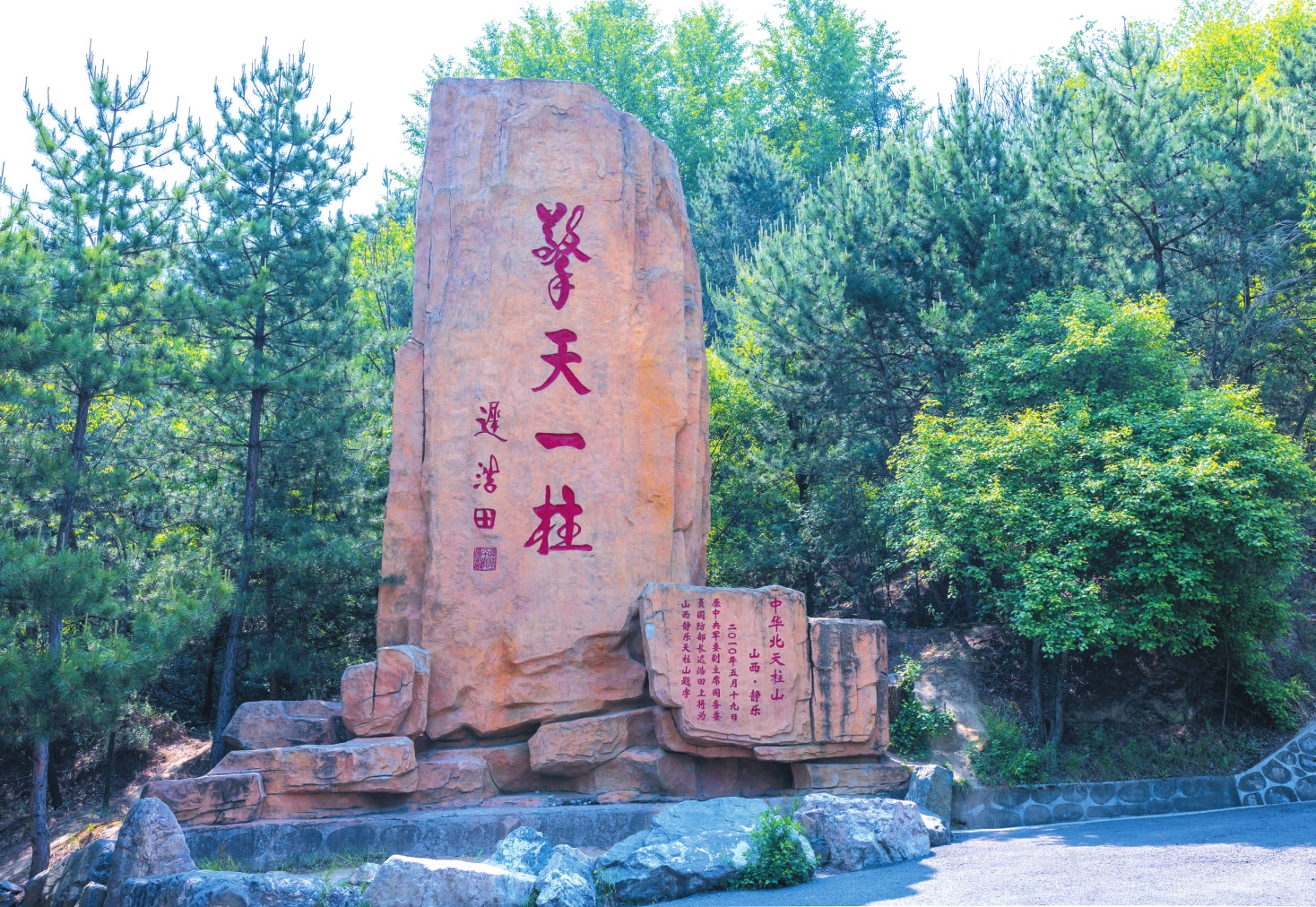 山路向南急轉(zhuǎn)后變得平坦舒緩起來,氣勢恢弘的建筑群呈現(xiàn)在眼前。右邊護(hù)坡上,是天柱山的“名人墻”,鑲嵌著靜樂九大名人的肖像,有功蓋千古的賢相,有戰(zhàn)功赫赫的名將,有學(xué)識(shí)淵博的鴻儒,有英勇無畏的革命者。不遠(yuǎn)處,一塊赭色大石莊嚴(yán)矗立,上面是中央軍委原副主席遲浩田上將于2010年5月為天柱山的題詞:擎天一柱。將軍蒼勁有力的書法,與山之威武相得益彰。
