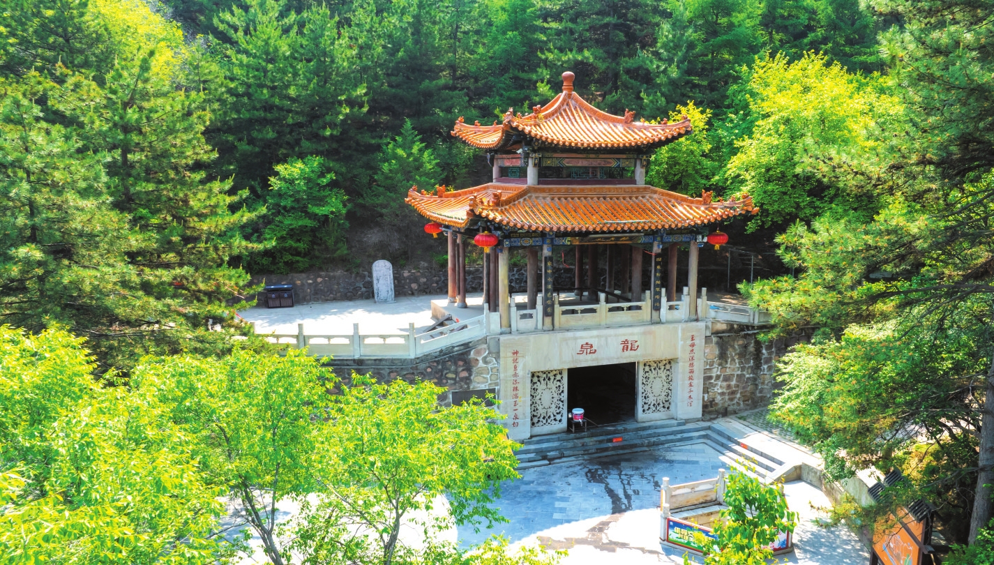 山有水而媚,土得水而沃。從大雄寶殿出來,沿著西門旁一條小道不遠(yuǎn)處,就是那片號(hào)稱“天柱松濤”的松林了。只見樹干筆直,枝條蒼勁,直指云霄,林間松脂飄香,氣息悠然。人還在松林中流連尋芳,遠(yuǎn)遠(yuǎn)就能聽到聞名已久的“天柱龍泉”在流淌。龍泉位于景區(qū)廟群西南的龍泉閣,作為“靜樂舊八景”之首的“天柱龍泉”,又名“犬舐泉”,《魏書》載:“爾朱榮高祖羽健居北秀容川。會(huì)有狗舐地,因而穿之,得甘泉,故名?!毕鄠魅谐錾颀?,故名龍泉。高山出泉是為奇觀,泉水清澈見底,旱不涸、澇不盈,夏飲清神,冬飲沁心。有“天柱圣境啟心智,龍泉奇觀令神怡”之頌。此泉水富含多種礦物質(zhì)和微量元素,是地地道道的“天然級(jí)礦泉水”。近幾年上山鍛煉的居民很多,人們上山時(shí)自帶裝水工具,攜泉水以做飯和飲用,期盼著龍泉水能給人帶來健康和好運(yùn)。站在龍泉邊,總能感受到一陣陣濕潤的水氣撲面而來,甚至像風(fēng)一樣輕繞著周身,使人置身于自然美景中不愿離開,連呼吸也變得無比暢快起來。