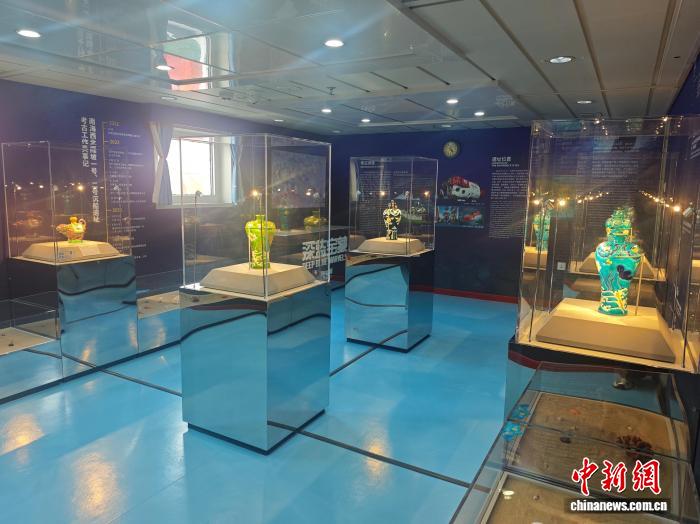 10月13日,全國首家海上流動(dòng)博物館升級改造落成儀式在三亞舉行。圖為“南海之夢”號郵輪上全新推出的“深藍(lán)寶藏——南海西北陸坡一二號沉船考古成果特展”主題展覽。張?jiān)潞?攝