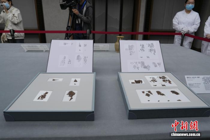 10月13日,流失海外79載的長(zhǎng)沙子彈庫(kù)戰(zhàn)國(guó)帛書(shū)第二、三卷《五行令》與《攻守占》正式入藏湖南省博物館。圖為楚帛書(shū)《五行令》殘片。中新社記者 楊華峰 攝