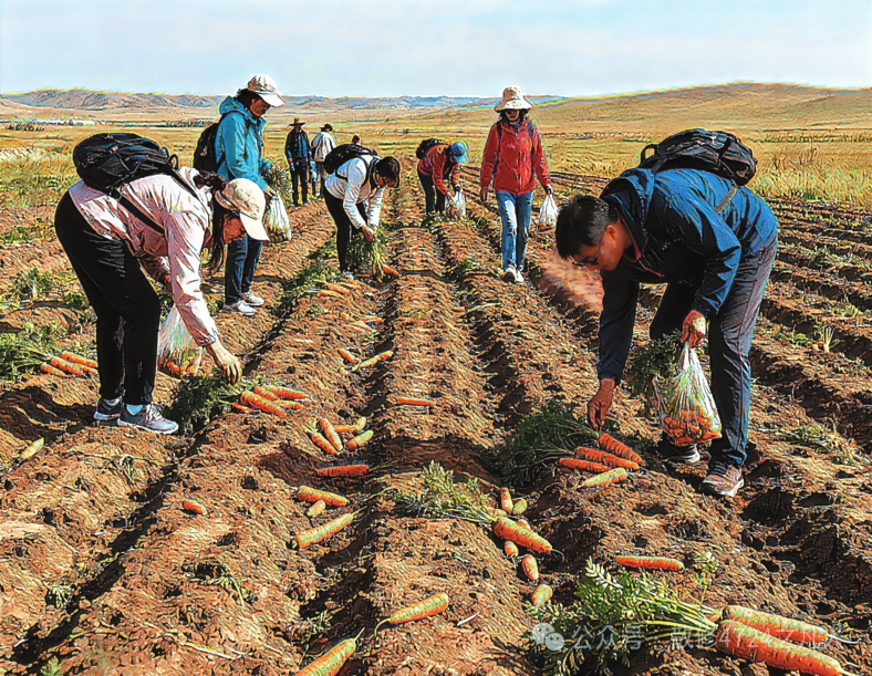 “撿秋”游演繹著“鄉(xiāng)土中國”的現(xiàn)代篇章。費(fèi)孝通在《鄉(xiāng)土中國》開篇即言“從基層上看去,中國社會是鄉(xiāng)土性的”。這種“鄉(xiāng)土性”的核心是人與土地的深度綁定。農(nóng)民靠土地生存,土地是文化認(rèn)同的根基?!皳烨铩边@種農(nóng)耕活動,如今以更加鮮活方式延續(xù)下來。對農(nóng)民而言,土地不僅是謀生手段,更是安身立命的“精神原鄉(xiāng)”。而城市游客的參與則賦予了“撿秋”新的意義。在城市里待久了,就想蹲在田里感受泥土的溫度,游客“撿秋”體驗(yàn)的是“春種秋收”踏實(shí)感。這種體驗(yàn)式參與是現(xiàn)代人對鄉(xiāng)土文明的“情感反哺”。游客們彎腰的身影既是對土地的致敬,也是對“根”的追尋。他們未必真懂農(nóng)事,但通過參與“撿秋”完成了對鄉(xiāng)土文化的認(rèn)同,被撿起的“果實(shí)”從“生存作物”演變?yōu)椤拔幕浇椤?。?dāng)前,內(nèi)蒙古各地推出的挖土豆、烤土豆等旅游項目是對鄉(xiāng)土資源的文化再“編碼”,當(dāng)土豆從田間走向游客的后備箱,“鄉(xiāng)土中國”便獲得了更加豐富的表達(dá)。