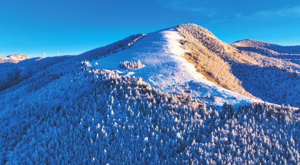 冬之凈,返璞歸真的意蘊(yùn)。當(dāng)一場(chǎng)大雪如期而至,金山梁便徹底沉靜下來(lái),進(jìn)入一個(gè)冰雕玉砌的童話世界。梁頂之上,積雪平整如鏡,宛如瓊瑤鋪地,反射著清冷而純粹的日光。而當(dāng)陽(yáng)光突破云層,照射在冰面上,則光芒閃耀,令人不敢直視。松枝上堆滿了蓬松的積雪,傲立于山崖,盡顯在嚴(yán)酷中堅(jiān)守的堅(jiān)韌品格;山間那些奇形怪狀的巖石,覆上白霜后,更是空蒙清靈,意韻悠長(zhǎng)。生命的痕跡并未完全消失,偶有野兔為了覓食奔躍而過(guò),在雪地上留下一串輕盈的足跡,但轉(zhuǎn)瞬便被新雪覆蓋,似乎了無(wú)痕跡;時(shí)有耐寒的鳥(niǎo)兒掠崖飛去,翅羽間振落的冰晶,在空中劃出一道優(yōu)美的弧線。