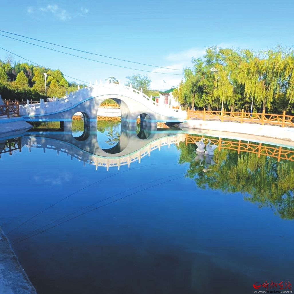 沿路而下,過橋爬坡,便到了天鵝湖。誰能想到,這碧水涵虛的景致,原是當(dāng)年造林蓄水的大水坑?工程完工后順勢修整,竟成飛龍山又一勝景。天鵝湖呈葫蘆狀,漢白玉拱橋橫跨腰間如玉帶,橋東石雕飛龍昂首欲飛,橋西石雕雙鵝戲水憨萌。湖水清澈見底,倒映藍(lán)天白云綠樹,風(fēng)過時漣漪擴(kuò)散,美得讓人心醉,連時間都慢了下來。