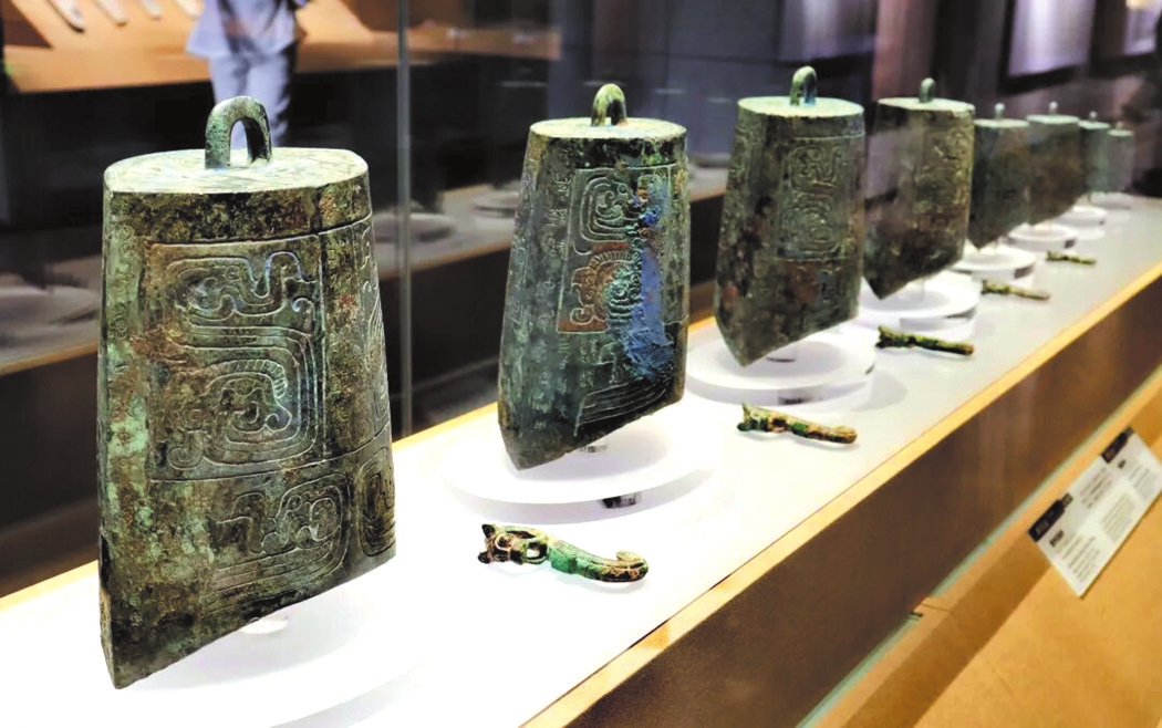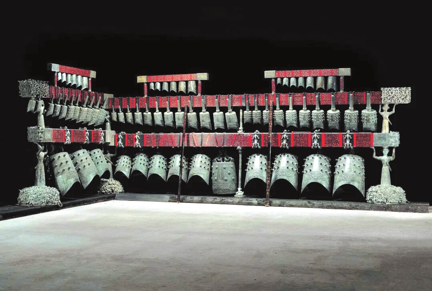 最具代表性的樂鐘無疑是“青銅之冠”的曾侯乙編鐘,它展現(xiàn)了先秦禮樂文明與青銅鑄造技術(shù)的最高成就。曾侯乙編鐘是戰(zhàn)國早期曾國國君的“禮樂重器”,1978年出土于今湖北隨州的曾侯乙墓,是迄今發(fā)現(xiàn)數(shù)量最多、保存最好、音律最全、氣勢最宏偉的一套編鐘,共65件,分3層8組懸掛于彩漆鐘架之上,鐘體總重達(dá)2.5噸。整套編鐘低音渾厚、中音圓潤、高音清脆,音域?qū)拸V,而且中心音域內(nèi)半音齊備,可以旋宮轉(zhuǎn)調(diào),演奏各種音樂。1978年8月1日,沉寂了2400多年的曾侯乙編鐘演奏了《東方紅》《國際歌》和古曲《楚殤》、民族歌曲《草原上升起不落的太陽》等各種樂曲,樂音悠揚回蕩。