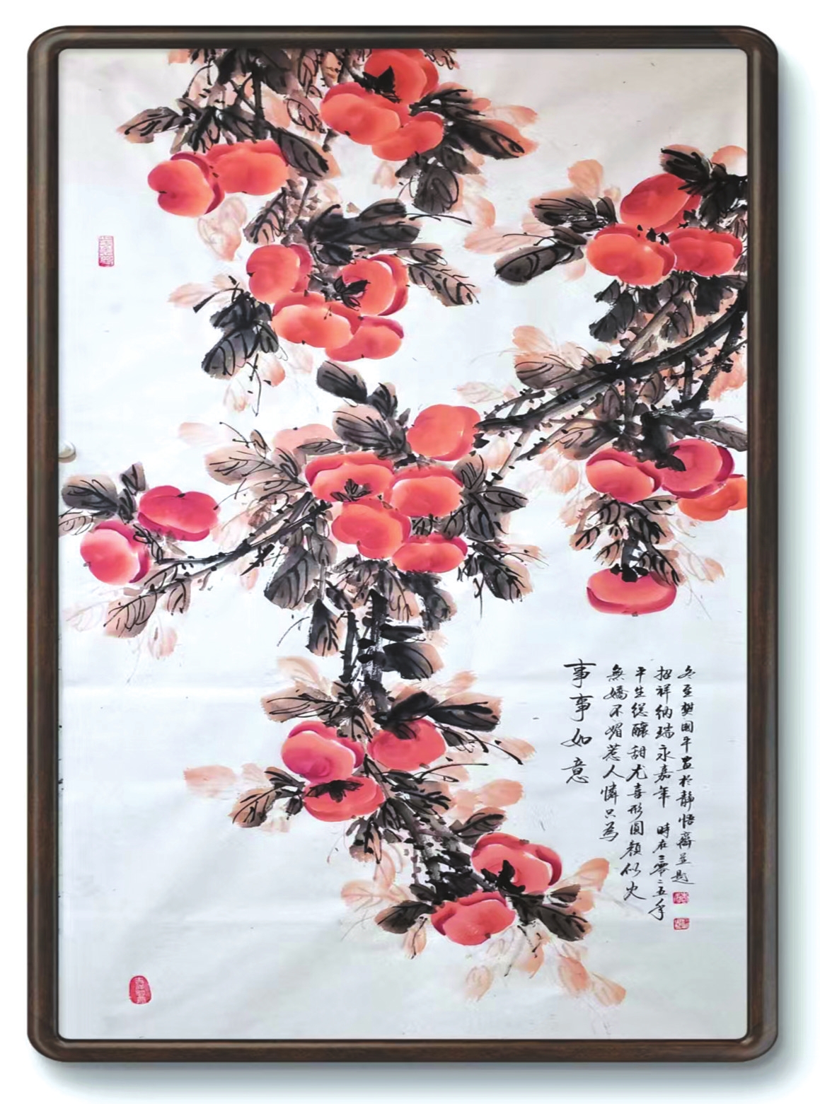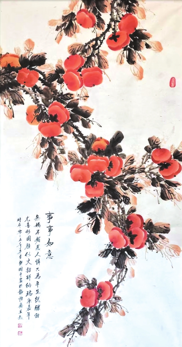 在樊國平眾多題材探索中,《事事如意》系列柿子圖可謂其藝術精神與人生哲思的縮影。這些作品超越了尋?;B畫的怡情悅性,成為她寄托情懷、叩問生命的重要載體。畫中那一串串、一簇簇丹柿,色澤溫潤,形態(tài)豐盈,承載著諧音“事事如意”的吉祥寓意,滿足了社會對美滿生活的樸素祈愿。她以此通俗意象為入口,引領觀者步入一個融匯儒、道、佛哲學理念的深邃境界,實踐著中國藝術“技進乎道”“以畫載道”的至高追求。