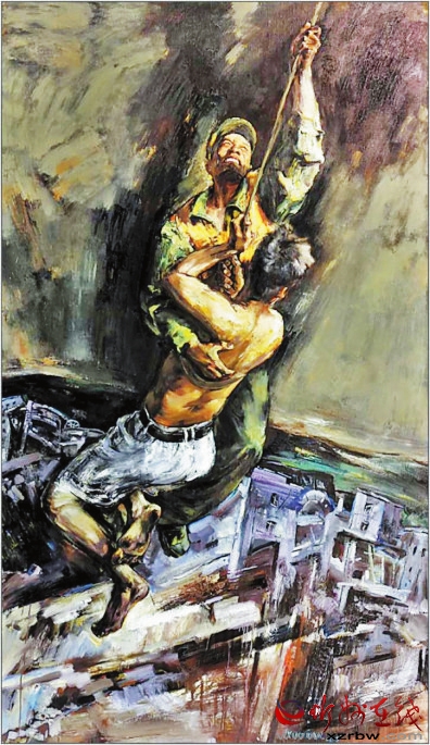 作品《空中救援》中,觀者首先感受到的就是難度。主題表現(xiàn)的事件難度和畫面表現(xiàn)處理的難度交織在一起,讓我們?cè)隗@險(xiǎn)、焦急的心理壓力下感受到生命的脆弱??罩芯仍闪松奈ㄒ煌ǖ馈>仍瑯邮请U(xiǎn)象環(huán)生、驚心動(dòng)魄。從畫面處理技巧上是一種挑戰(zhàn),天空與地面的透視關(guān)系,動(dòng)感與靜態(tài)的對(duì)立統(tǒng)一,那種命懸一線的緊迫感對(duì)心理的沖擊力,通過(guò)大刀闊斧的刮刀、筆觸處理,和蒼涼緊迫的色調(diào)關(guān)系,準(zhǔn)確地展示了主題思想,大膽省略了一些不必要的細(xì)節(jié)描寫。用大筆觸、大色塊表現(xiàn)背景的壓抑和險(xiǎn)峻,救援主體成為沖破這一重壓的希望之色。沒(méi)有去刻意刻畫天與地的真實(shí)場(chǎng)景,簡(jiǎn)潔概括但不呆板空洞,這種果斷的駕馭,是續(xù)鶴賢真實(shí)實(shí)力的體現(xiàn)。 邢晨聲 文
