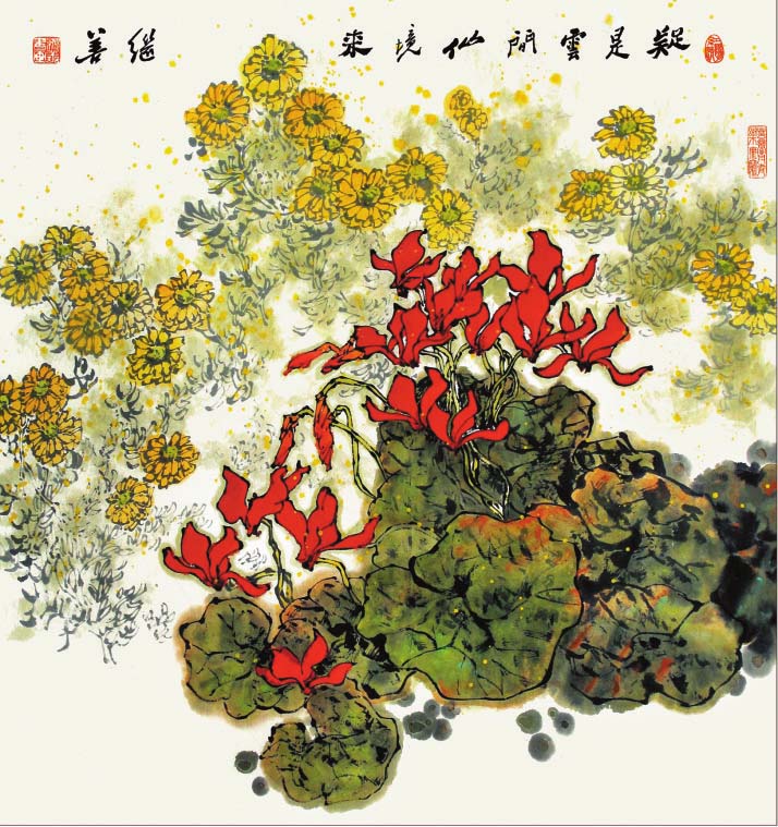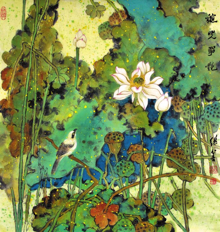 郜繼善的重彩花鳥畫偏傳統(tǒng),筆法細(xì)膩工整,色彩明麗典雅,構(gòu)圖大氣別致,情趣盎然,意境深遠(yuǎn)。作品中各種元素有機(jī)融合,自然穿插,形成和諧有序的布局,讓人既能感受到自然界的豐富與絢爛,又可體味藝術(shù)帶來的愉悅和感動(dòng)。在他的筆下,重彩成為了最具藝術(shù)感染力的手段,也是最有個(gè)性藝術(shù)特征的語言,鮮明、強(qiáng)烈,可謂“脫盡媚俗寫重彩”。
