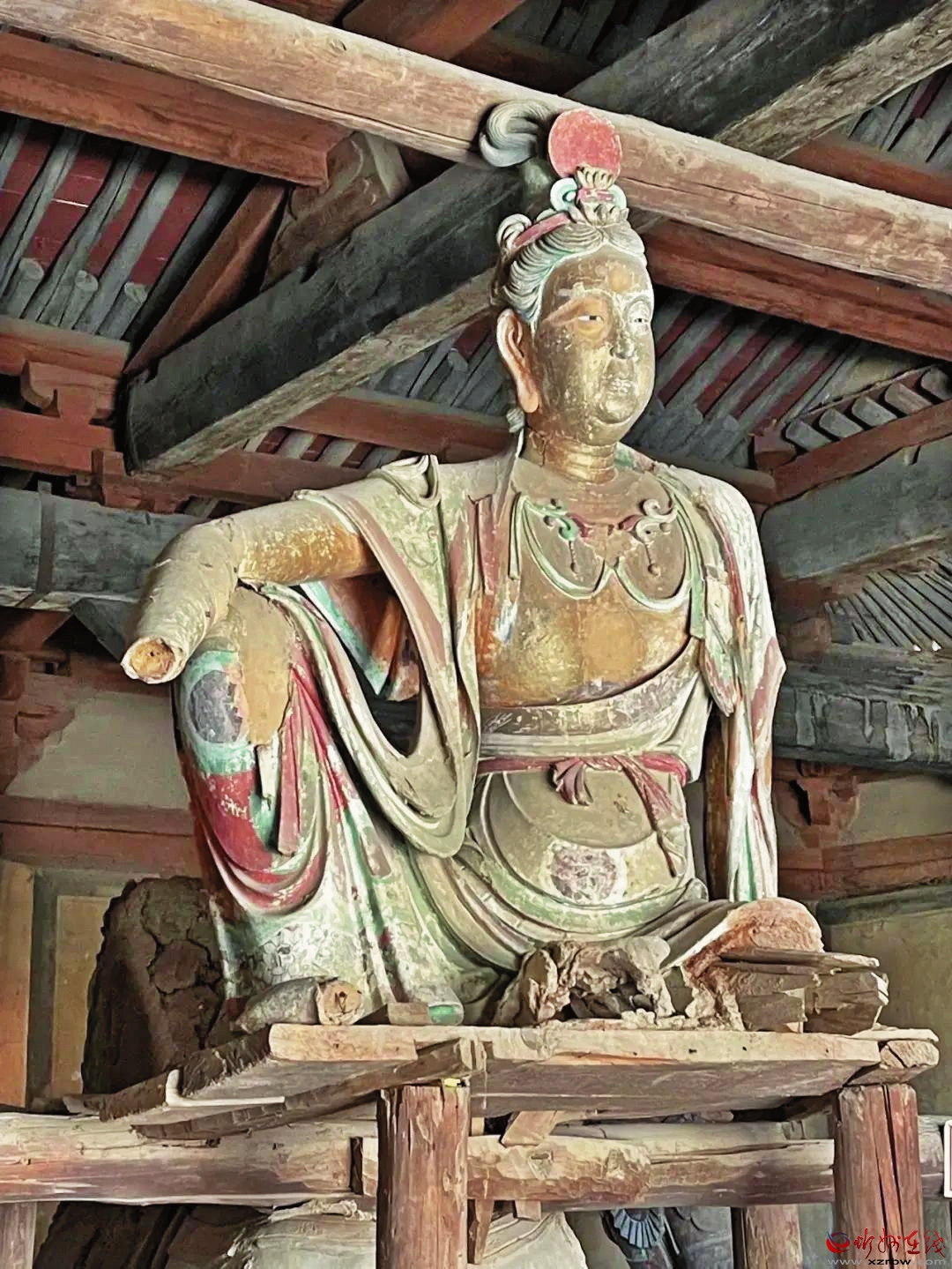 巖山寺坐北朝南,平面呈不規(guī)則長方形。寺內(nèi)正殿已毀,現(xiàn)存建筑主要有文殊殿、伽藍(lán)殿、地藏殿、馬王殿等。其中,文殊殿面闊五間,進(jìn)深六椽,單檐歇山頂。殿內(nèi)保存有金代彩塑水月觀音、脅侍、天王和文殊坐騎等。水月觀音面額豐腴,衣帶飄灑,若乘風(fēng)翩翩欲飛。
