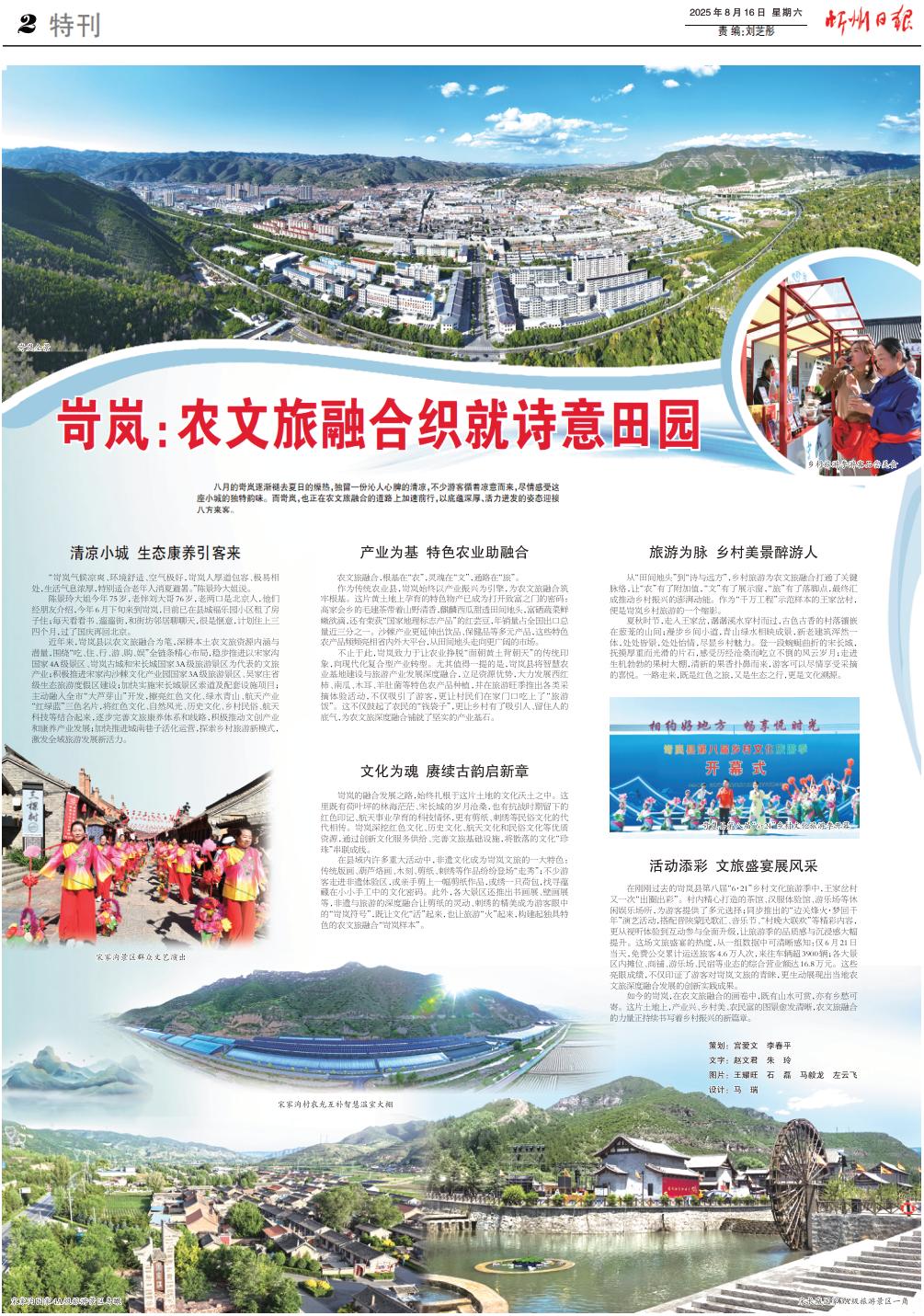 從“田間地頭”到“詩與遠方”,鄉(xiāng)村旅游為農(nóng)文旅融合打通了關(guān)鍵脈絡,讓“農(nóng)”有了附加值,“文”有了展示窗,“旅”有了落腳點,最終匯成推動鄉(xiāng)村振興的澎湃動能。作為“千萬工程”示范樣本的王家岔村,便是岢嵐鄉(xiāng)村旅游的一個縮影。