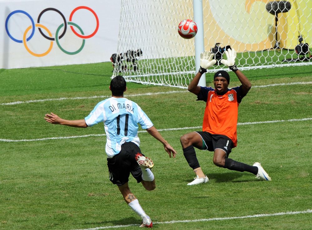 2008年8月23日,阿根廷隊(duì)球員迪馬利亞(左)破門得分。當(dāng)日,北京奧運(yùn)會(huì)男子足球決賽在國家體育場——“鳥巢”舉行,阿根廷隊(duì)迎戰(zhàn)尼日利亞隊(duì)。新華社記者 李鋼 攝
