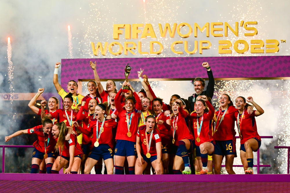 2023年8月20日,西班牙隊(duì)?wèi)c祝奪冠。當(dāng)日,在澳大利亞悉尼舉行的2023年國際足聯(lián)女足世界杯決賽中,西班牙隊(duì)1:0戰(zhàn)勝英格蘭隊(duì),獲得冠軍。新華社記者 朱煒 攝