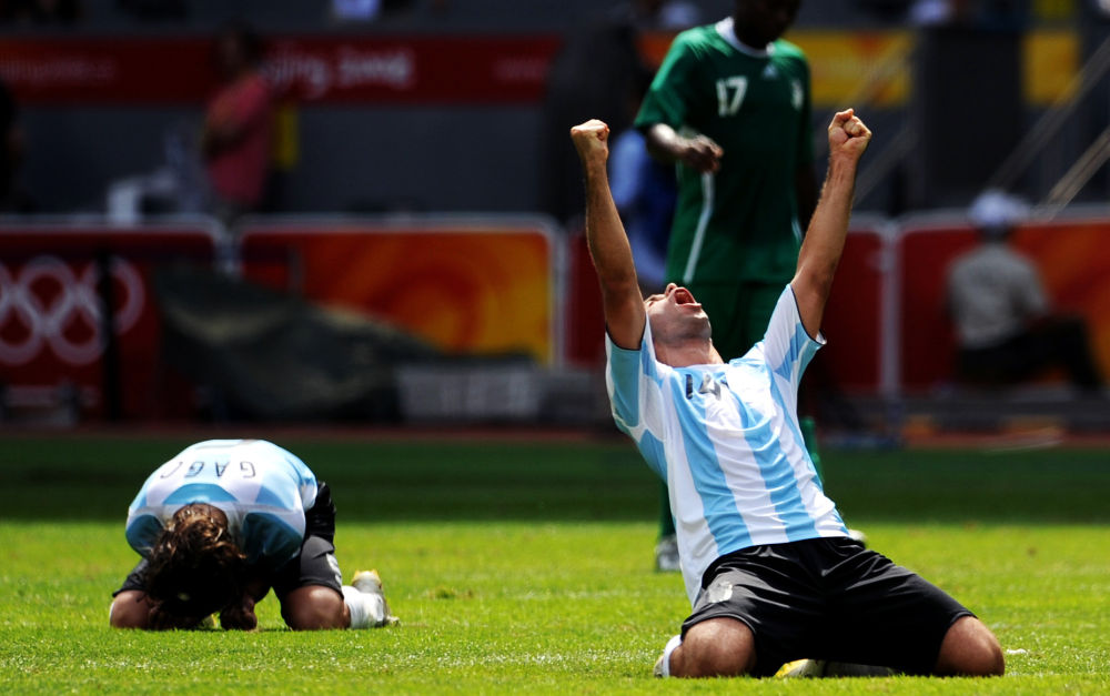 2008年8月23日,阿根廷隊(duì)球員馬斯切拉諾(右)慶祝勝利。當(dāng)日,北京奧運(yùn)會(huì)男子足球決賽在國家體育場——“鳥巢”舉行,阿根廷隊(duì)1:0戰(zhàn)勝尼日利亞隊(duì)獲得冠軍。新華社記者 楊磊 攝