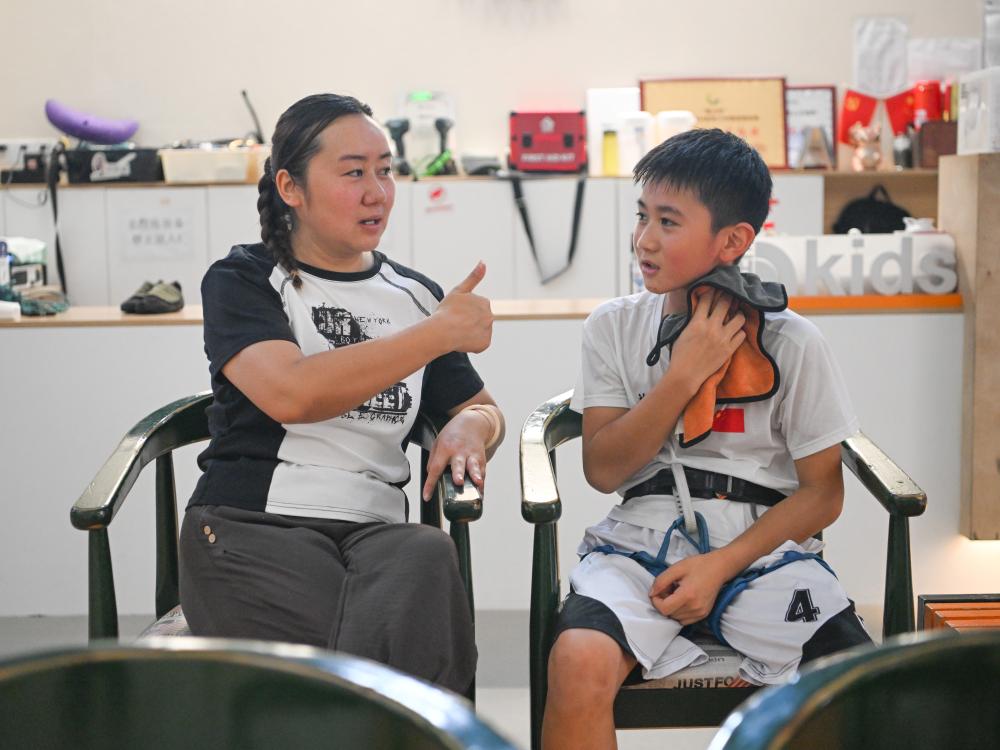 7月16日,方先旻的媽媽在訓(xùn)練間隙鼓勵孩子。新華社記者 王曦 攝
