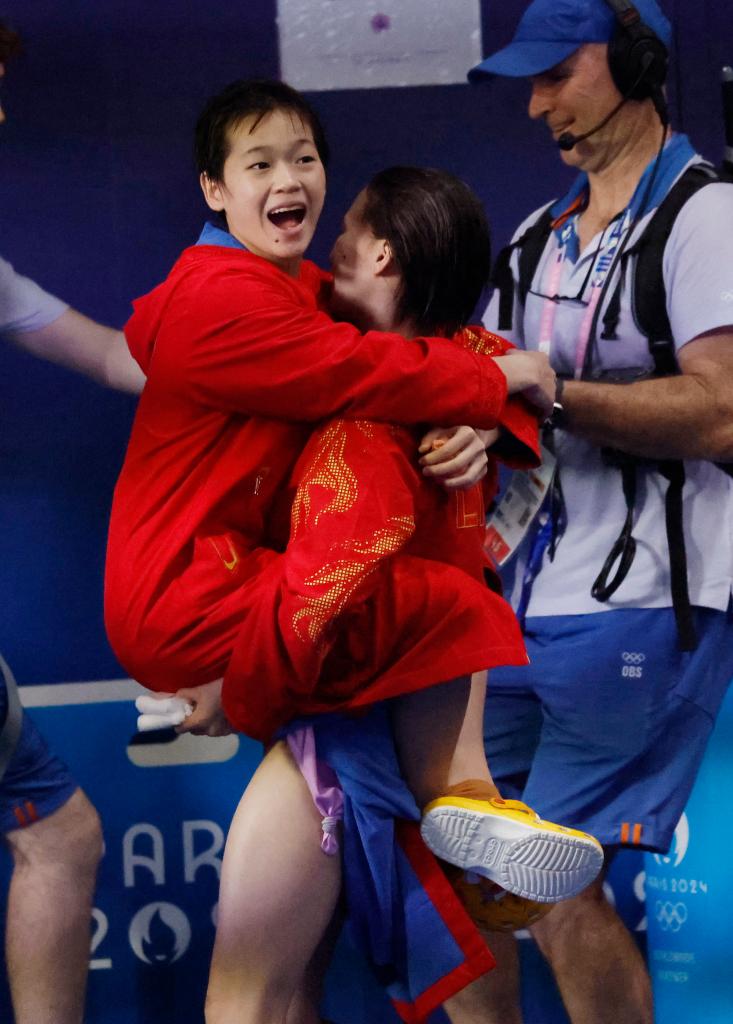 奪冠后陳芋汐一把抱起全紅嬋,還走了幾米,全紅嬋用手指比劃著捏東西的樣子?!拔疫@就是拿捏的意思!”她在混合采訪區(qū)告訴記者。