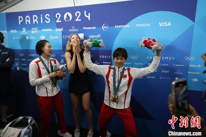 當(dāng)?shù)貢r(shí)間7月31日,在巴黎奧運(yùn)會(huì)跳水女子雙人10米臺(tái)項(xiàng)目中,中國(guó)隊(duì)組合陳芋汐/全紅嬋獲得冠軍。谷愛(ài)凌(中)在賽后化身粉絲與陳芋汐(左)、全紅嬋合影。 中新社記者 富田 攝
