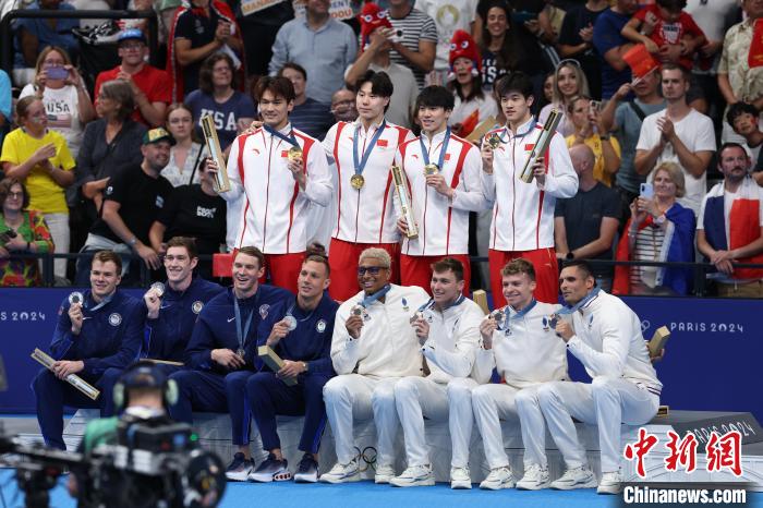 當(dāng)?shù)貢r(shí)間8月4日,在巴黎奧運(yùn)會(huì)游泳項(xiàng)目男子4x100米混合泳接力決賽中,由徐嘉余、覃海洋、孫佳俊、潘展樂(lè)組成的中國(guó)隊(duì)奪得金牌。圖為獲獎(jiǎng)運(yùn)動(dòng)員合影。 中新社記者 富田 攝