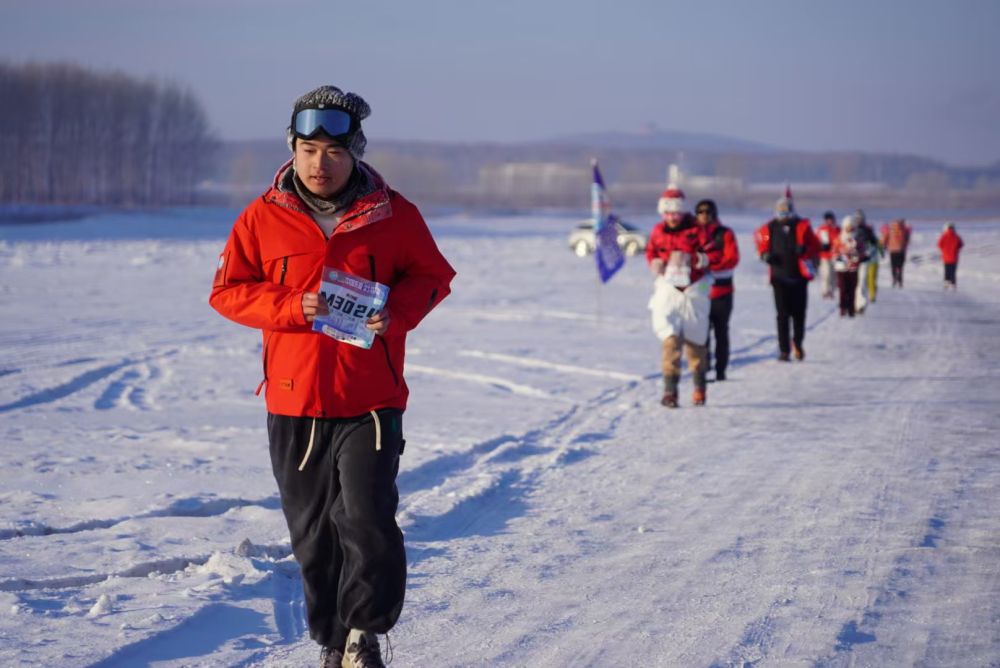 身穿速干衣、抓絨外套,頭戴帽子口罩,腳踩用于防滑的冰爪,不少跑友“全副武裝”,以抵擋戶外嚴寒?!拔颐總€月至少參加兩場馬拉松比賽,但這是第一次參加冰上的,很有新鮮感。這里和我們那邊的溫差能達到近60攝氏度。沿途風景很遼闊,讓人心情愉悅?!睆V州游客劉俊逸說,本次比賽賽事保障很到位,在冰面跑步也讓人安全感滿滿。