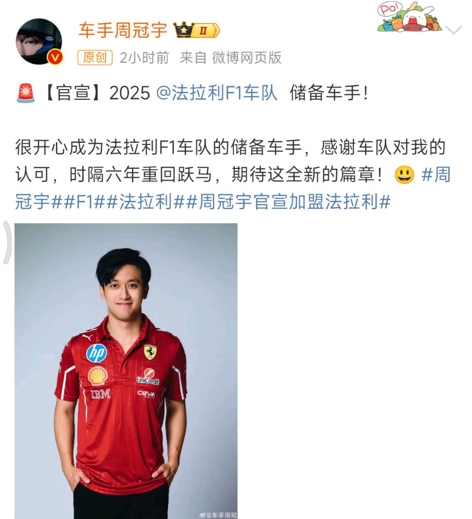 周冠宇通過個(gè)人社交平臺(tái)表示:“很開心成為法拉利F1車隊(duì)的儲(chǔ)備車手,感謝車隊(duì)對我的認(rèn)可,時(shí)隔六年重回‘躍馬’,期待這全新的篇章!”2015年至2018年間,周冠宇曾在法拉利青訓(xùn)學(xué)院度過四年時(shí)光。
