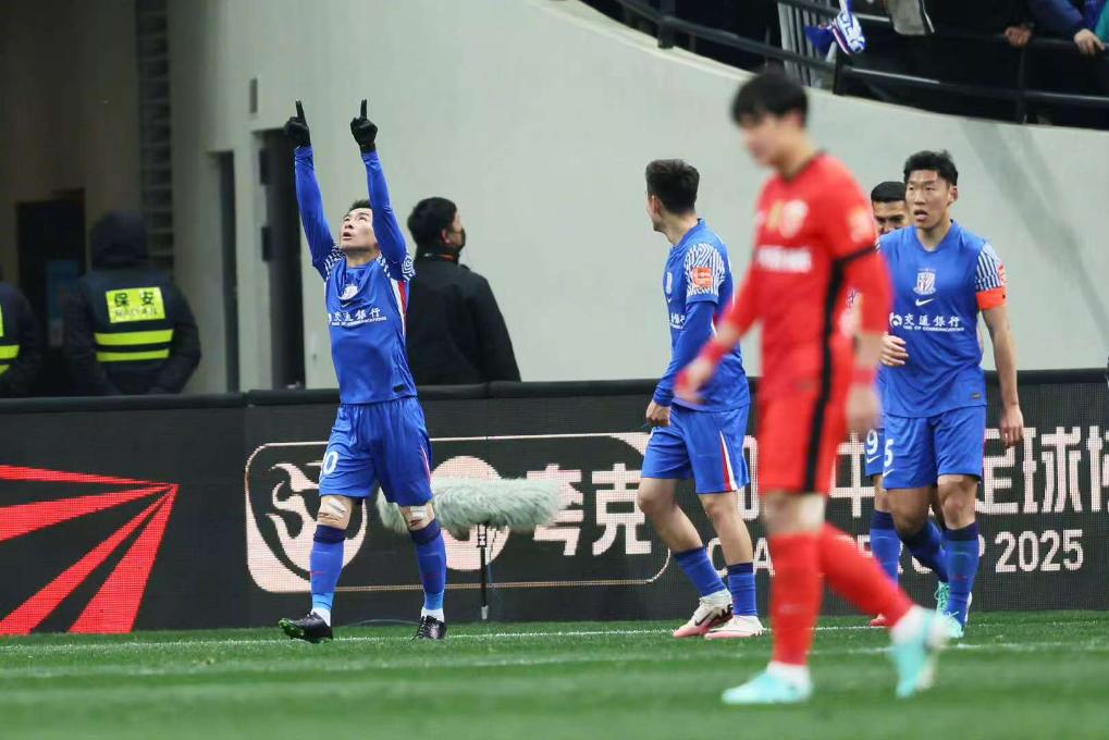 2月7日,上海申花隊(duì)球員于漢超(左)在進(jìn)球后慶祝。圖片來自上海申花足球俱樂部官方微博