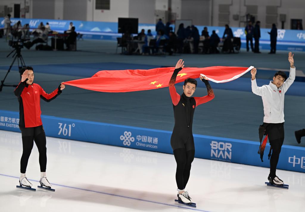 黑龍江省冰上訓練中心速滑館里,《義勇軍進行曲》三度奏響。當日速度滑冰全部3枚金牌均被中國隊收入囊中。高亭宇先以0.02秒的微弱優(yōu)勢力壓日本選手森重航,奪得男子500米冠軍;又與隊友廉子文、寧忠?guī)r合作,奪得男子短距離團體追逐金牌。女隊則又一次讓三面五星紅旗同時升起,楊濱瑜、韓梅、太智恩分獲女子3000米前三名。本屆亞冬會有三金入賬的高亭宇坦言不知道這會不會是自己最后一屆亞冬會,“(這次)我的關(guān)鍵詞是努力,相信大家一起努力,中國速度滑冰會越來越好”。
