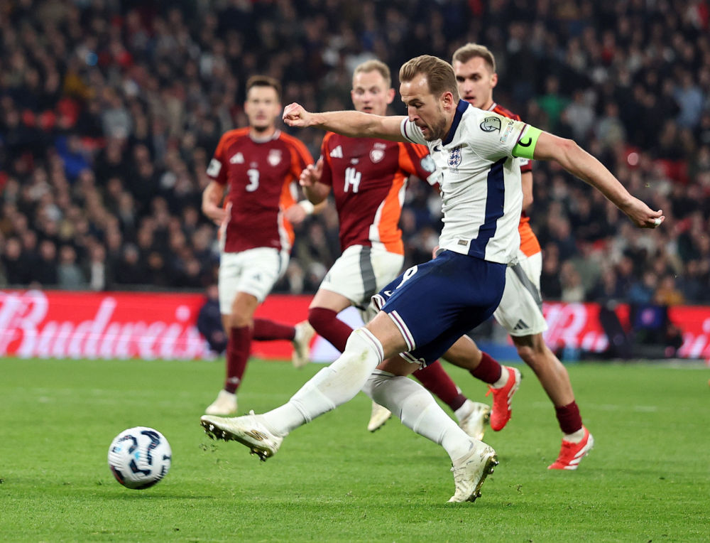 3月24日,英格蘭隊(duì)球員凱恩(前)在比賽中射門得分。新華社/路透