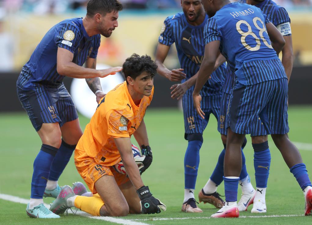 6月18日,利雅得新月隊球員慶祝門將布努(左二)撲出皇家馬德里隊球員巴爾韋德主罰的點球。新華社記者 李明 攝