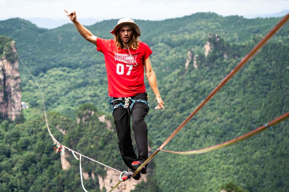 高空扁帶上,參賽選手們?nèi)缏钠降?,甚至還在扁帶上做出高難度動(dòng)作,向觀眾展現(xiàn)扁帶運(yùn)動(dòng)的技巧性、藝術(shù)性和刺激性。