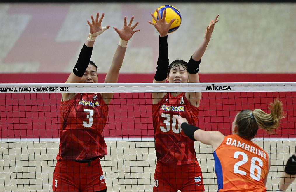 日本隊(duì)球員在比賽中攔網(wǎng)。新華社記者 侯昭康 攝