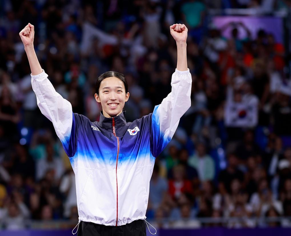 2024年8月8日,獲得冠軍的韓國選手金宥珍在巴黎奧運會跆拳道女子57公斤級決賽頒獎儀式上。新華社記者 費茂華 攝