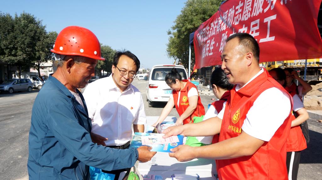 為深入貫徹落實(shí)習(xí)近平新時代中國特色社會主義思想和黨的十九大及十九屆二中、三中、四中全會精神,貫徹落實(shí)《保障農(nóng)民工工資支付條例》和國家、山西省關(guān)于農(nóng)民工服務(wù)工作的部署,切實(shí)加強(qiáng)我市農(nóng)民工安全生產(chǎn)意識,提高農(nóng)民工的維權(quán)意識和維權(quán)能力,8月13日下午,忻州市司法局組織市法律援助中心、公證處、律師事務(wù)所、司法鑒定中心組成法律援助志愿服務(wù)隊(duì),走進(jìn)忻州古城建筑工地現(xiàn)場,開展了“法援惠民生·助力農(nóng)民工”法律援助志愿服務(wù)活動。