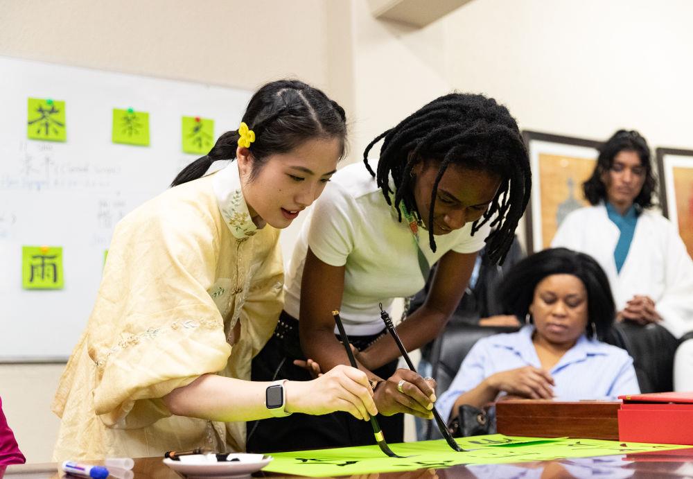 △2025年4月17日,在南非約翰內斯堡,學生與孔子學院志愿者在“國際中文日”活動上寫毛筆字。