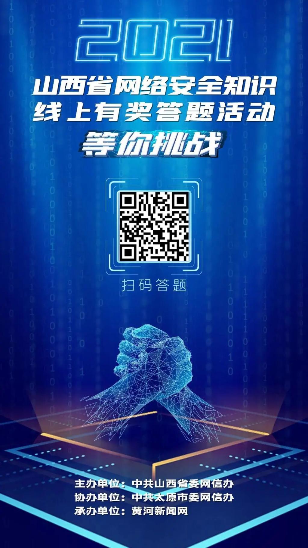 為深入宣傳貫徹《中華人民共和國網絡安全法》等相關法律法規(guī),進一步普及網絡安全知識,提升全社會網絡安全意識和防護技能,在2021年國家網絡安全宣傳周期間,由中共山西省委網信辦主辦、中共太原市委網信辦協(xié)辦、黃河新聞網承辦的“2021山西省網絡安全知識線上有獎答題活動”于10月9日正式啟動。