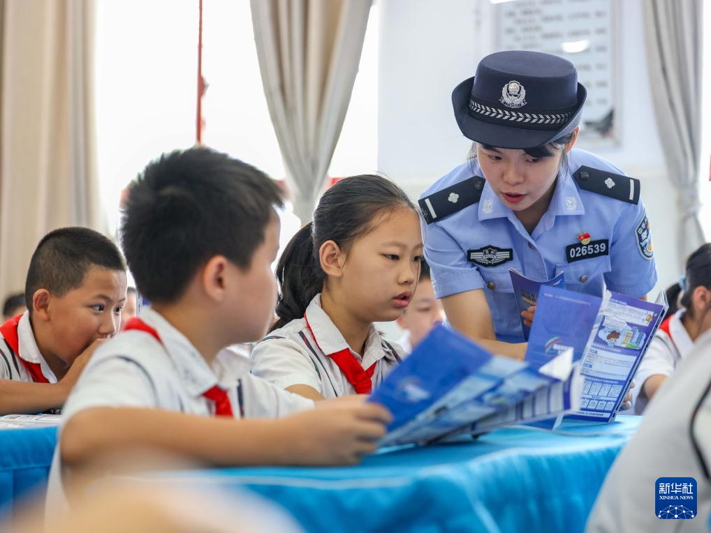 9月11日,公安民警在貴州省銅仁市玉屏侗族自治縣印山民族小學(xué)給學(xué)生講解網(wǎng)絡(luò)安全知識。(新華社發(fā) 胡攀學(xué) 攝)