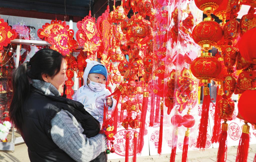 近日,在原平市小集鎮(zhèn)批發(fā)市場,人們紛紛選購大紅“福”字、紅燈籠、中國結(jié)、春聯(lián)、生肖虎元素的節(jié)日喜慶物品,紅紅火火迎接新春佳節(jié)。 (褚 震 攝)
