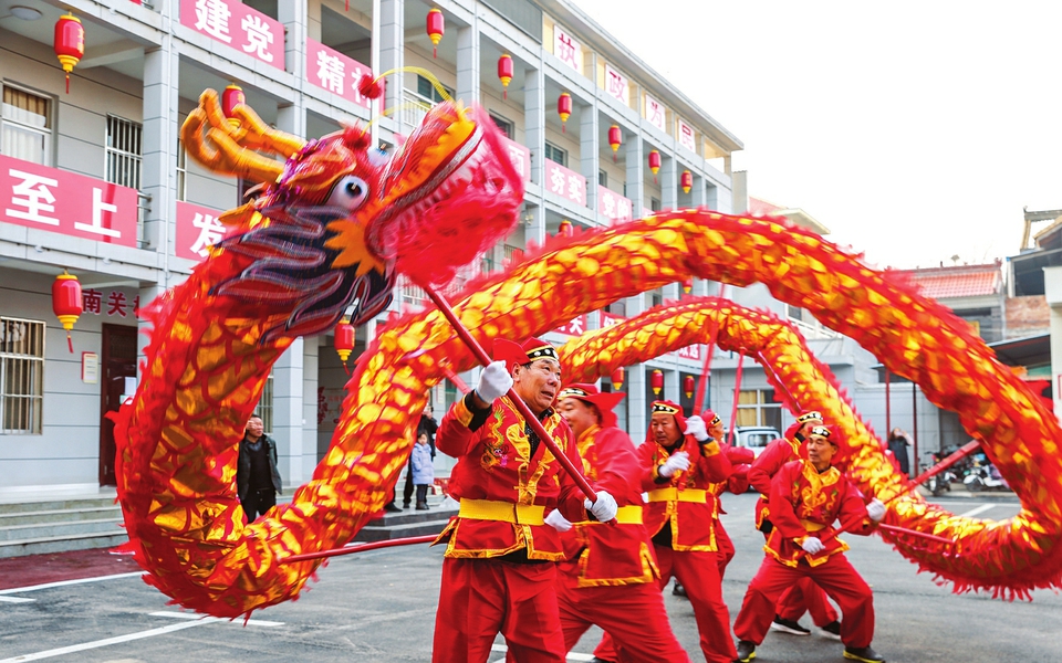 2月9日,在夏縣瑤峰鎮(zhèn)南關(guān)村黨群服務(wù)中心,村民在進(jìn)行《二龍戲珠》民間社火表演,喜迎新春佳節(jié)。張秀峰 裴國峰攝