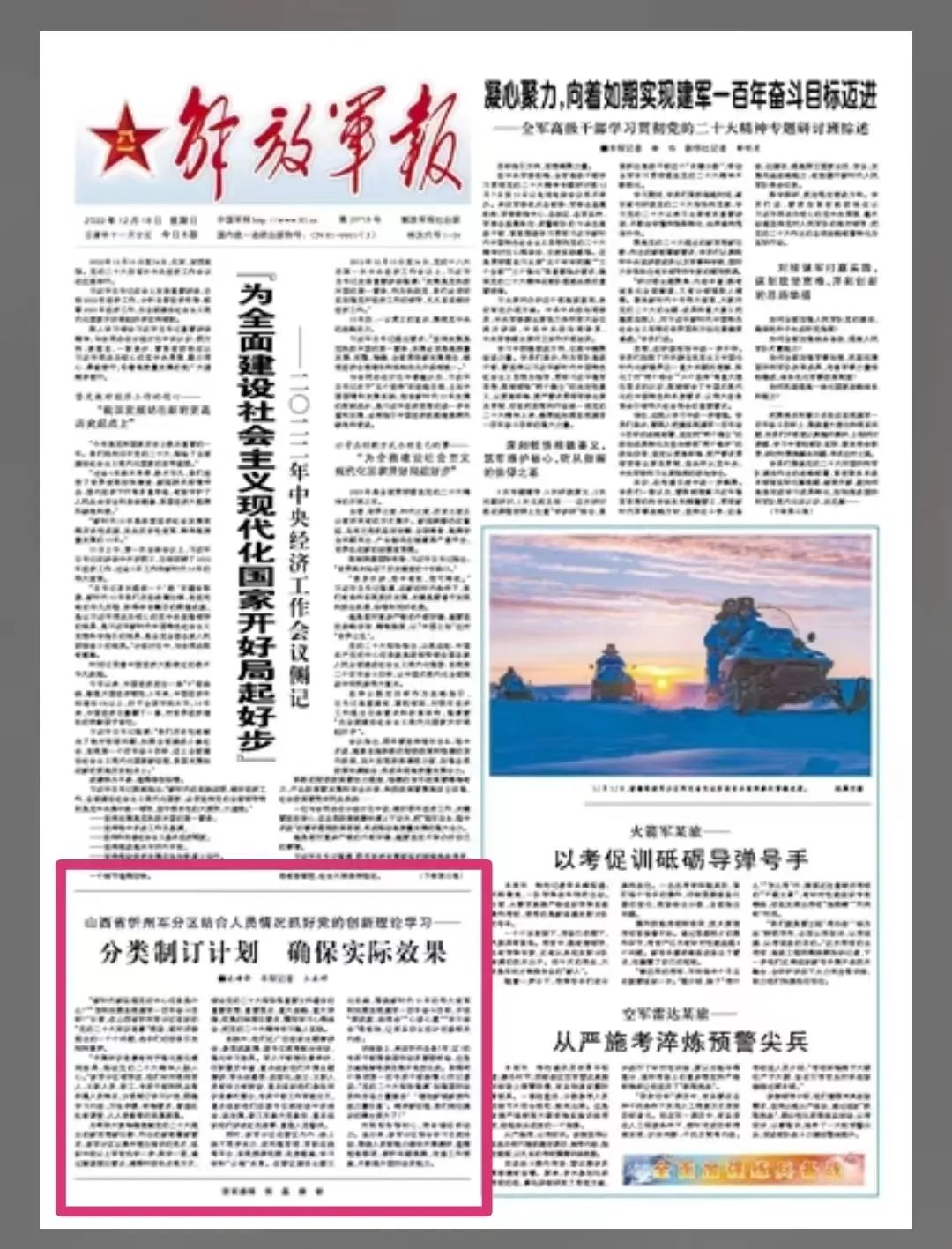 “開(kāi)展知識(shí)競(jìng)賽有利于強(qiáng)化理論浸潤(rùn)效果,推動(dòng)黨的二十大精神入腦入心?!痹撥姺謪^(qū)領(lǐng)導(dǎo)說(shuō),他們針對(duì)現(xiàn)役軍人、文職人員、職工、專武干部和民兵等所屬人員特點(diǎn),分類制定學(xué)習(xí)計(jì)劃,明確學(xué)習(xí)內(nèi)容、方法步驟、標(biāo)準(zhǔn)要求,營(yíng)造處處有課堂、人人受教育的濃厚氛圍。