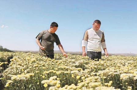有了方向,行動是關(guān)鍵。黨員徐大衛(wèi)主動請纓,第一時(shí)間不遠(yuǎn)千里趕赴菊花主產(chǎn)區(qū)射陽考察菊花種植項(xiàng)目,經(jīng)過充分分析研判,篩選適宜五寨種植的品種,最終選定北京菊試種。同時(shí),他帶著誠意誠心,從射陽請來3名技術(shù)專家。在晉西北中藥材產(chǎn)業(yè)孵化園附近,他與3位專家同吃同住,深入田間地頭,與群眾同勞作、共生活。依據(jù)菊花種植要求,手把手教會群眾平整土地、開挖溝槽、栽種澆水、鋤草施肥和采挖收儲等中藥材精耕細(xì)作技術(shù)。針對菊花農(nóng)殘、重金屬超標(biāo)的問題,在試種過程中,他精心研究、反復(fù)摸索,大膽探索出了一套適用于菊花的種植技術(shù),實(shí)現(xiàn)了菊花農(nóng)殘可控的突破,先試種的100畝菊花,獲得了成功。