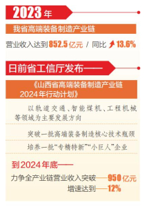 省工信廳日前發(fā)布《山西省高端裝備制造產(chǎn)業(yè)鏈2024年行動計劃》,確立年度推進目標(biāo):以軌道交通、智能煤機、工程機械等領(lǐng)域為主要發(fā)展方向,突破一批高端裝備制造核心技術(shù)瓶頸,培養(yǎng)一批“專精特新”“小巨人”企業(yè),提升全產(chǎn)業(yè)鏈科技創(chuàng)新能力,強化高端裝備制造供應(yīng)鏈穩(wěn)定性和配套能力。并提出,到2024年底,力爭全產(chǎn)業(yè)鏈營業(yè)收入突破950億元,增速達到12%。