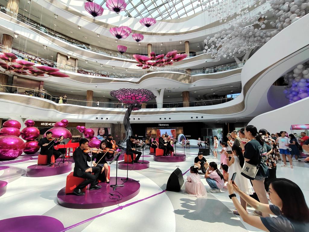 端午假期,??趪H免稅城內(nèi),伴隨著悠揚(yáng)的音樂,陽光傾瀉“天際秘林”夢幻舞臺(tái),正在購物的游客們紛紛駐足欣賞?!耙粓鍪覂?nèi)音樂會(huì),給購物消費(fèi)增添了新意和氛圍感?!焙?谑忻耜惱俪两陉柟夂鸵魳分小?/p>